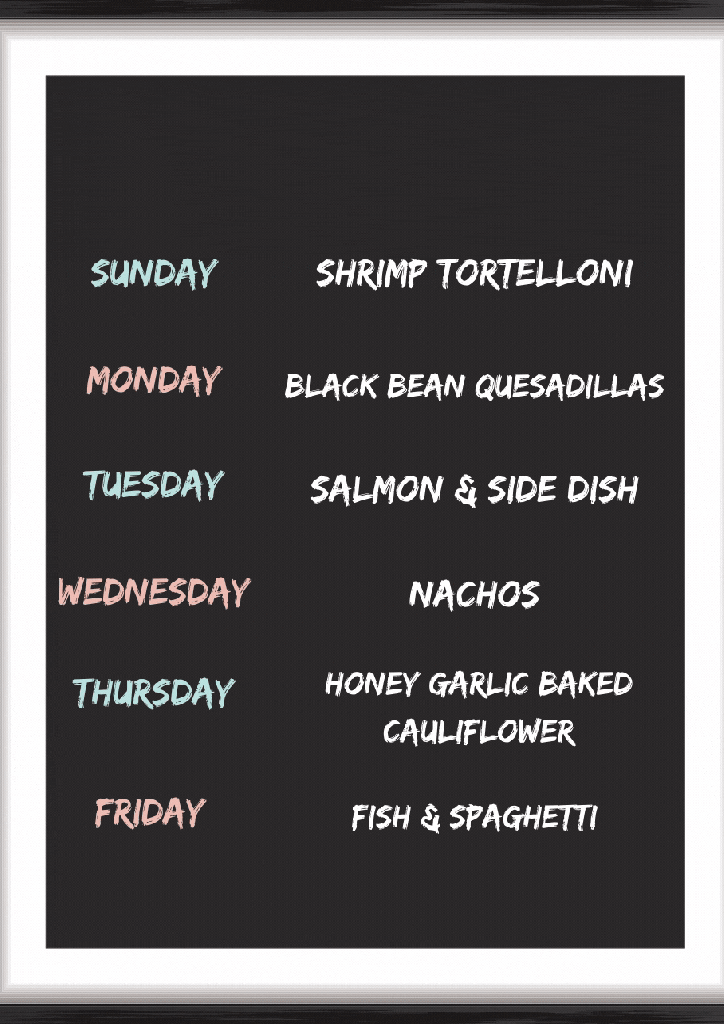 We use a chalkboard to write out the dinner menu for Sunday – Friday. Saturdays are always leftover day or takeout day. It’s our treat for staying on task during the week. Since we live a Pescatarian lifestyle, there are at least two seafood dishes per week. I try to include some form of meat weekly as I do still have a growing teenager in the home.