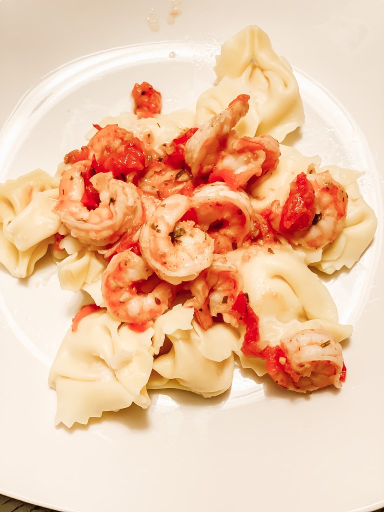While at Costco, I picked up a package of cilantro lime shrimp. And this day it was $3.00 off. This would be the highlight of the dish. Costco also has a two pack of Five Cheese Tortelloni with Parmigiano Reggiano for $9.99. And like any Costco item, these are not small. Which also means leftovers for lunch tomorrow.