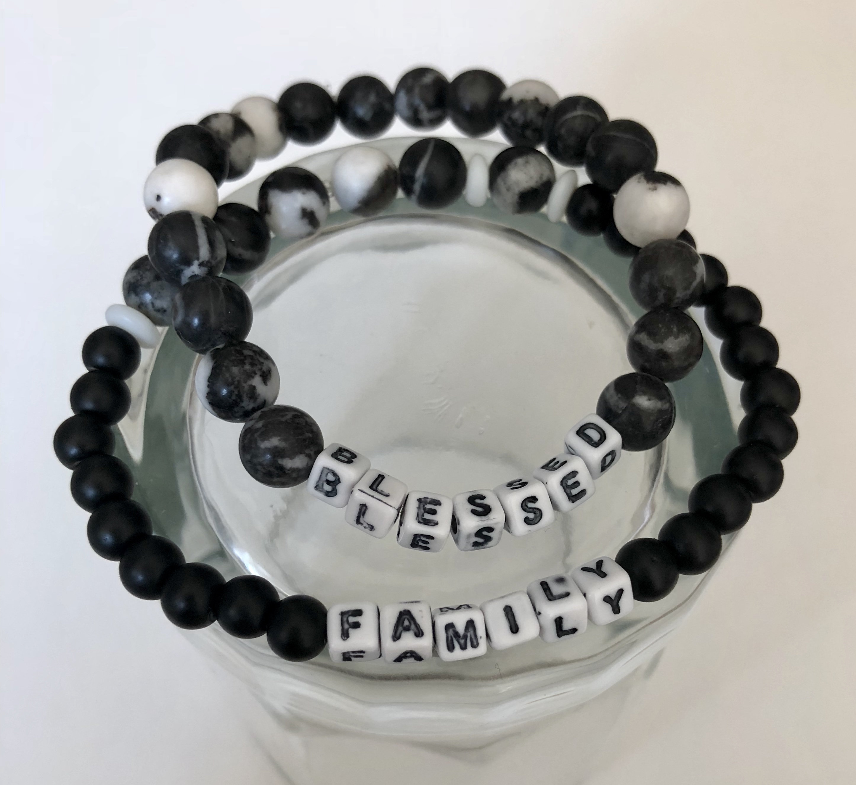 Messages spelled out in small block letters between black and white beads. Messages vary but range among: Blessed, Family, Love, Faith, Perseverance, and Intelligence.