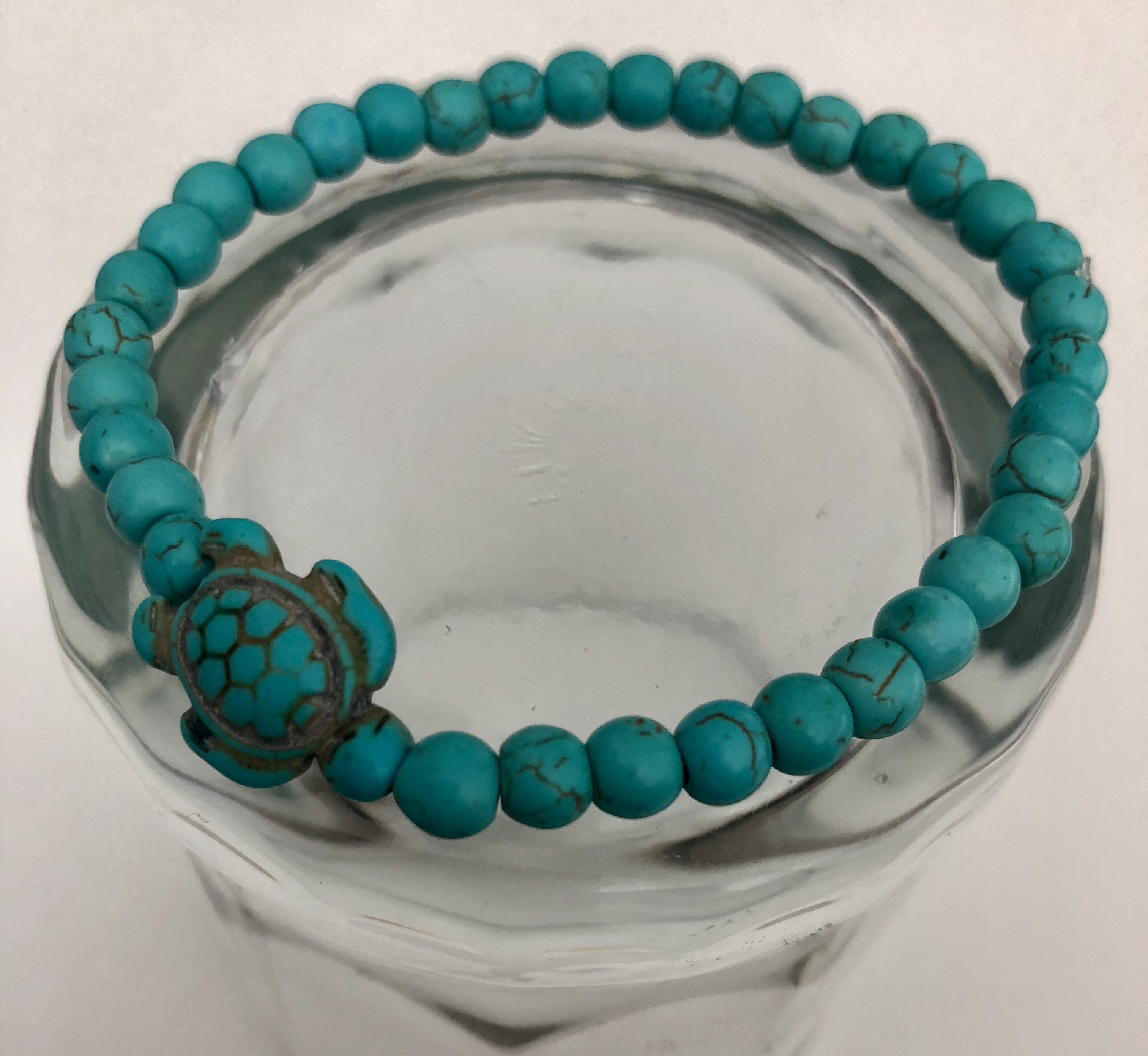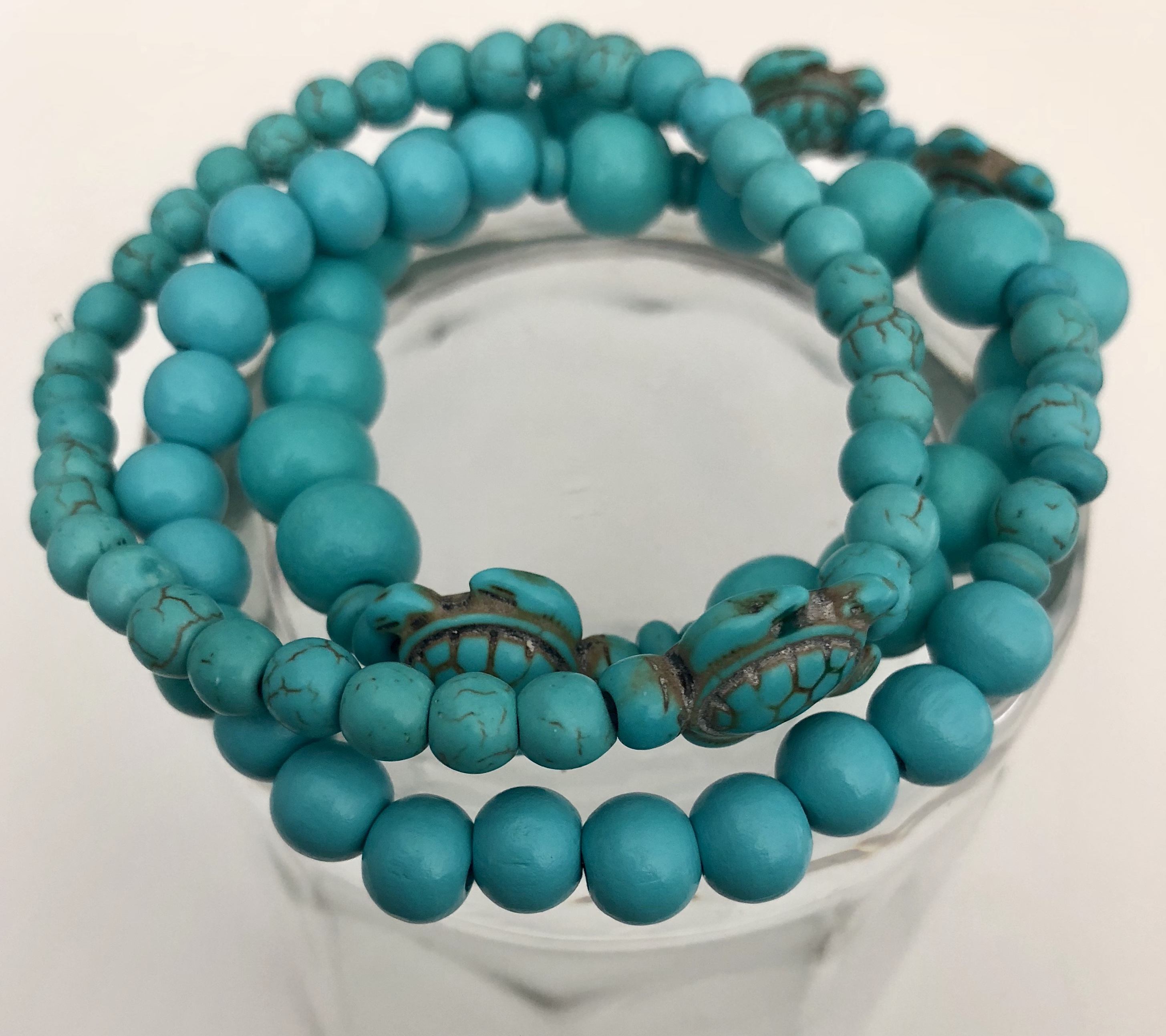 Stackable turquoise bracelets available as individuals or a set of three. Wooden turquoise beads with speckles of gold reflect the ocean home of the turtles. Set of three is $20; Individual bracelets are $10 each.
