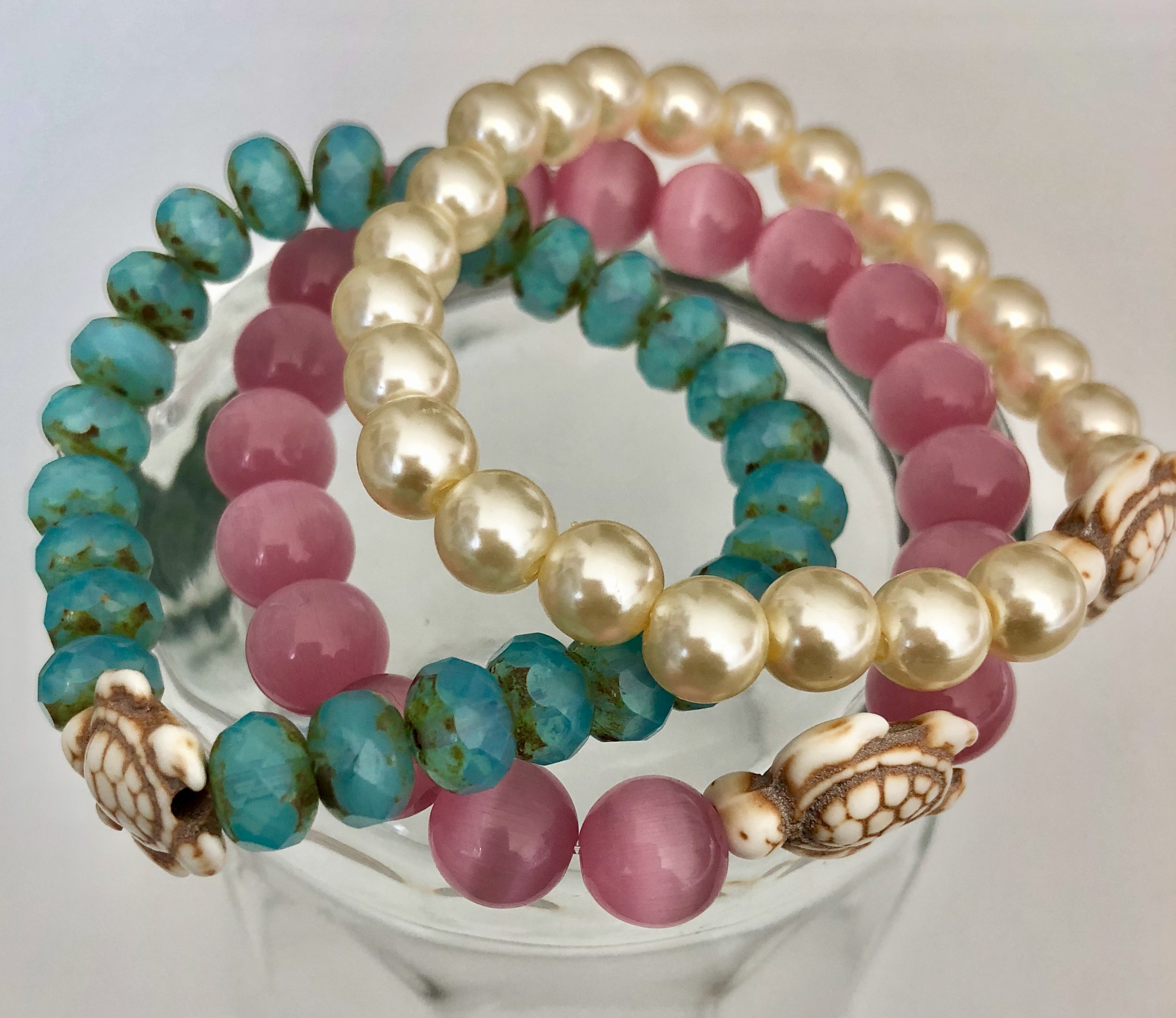 Single turtle bracelets available as individuals or a set of three. Glass beads with single carved turtle can be worn daily or on a special occasion. Color options are: Coral, Pearl, or Turquoise Set of three is $20; Individual bracelets are $10 each.